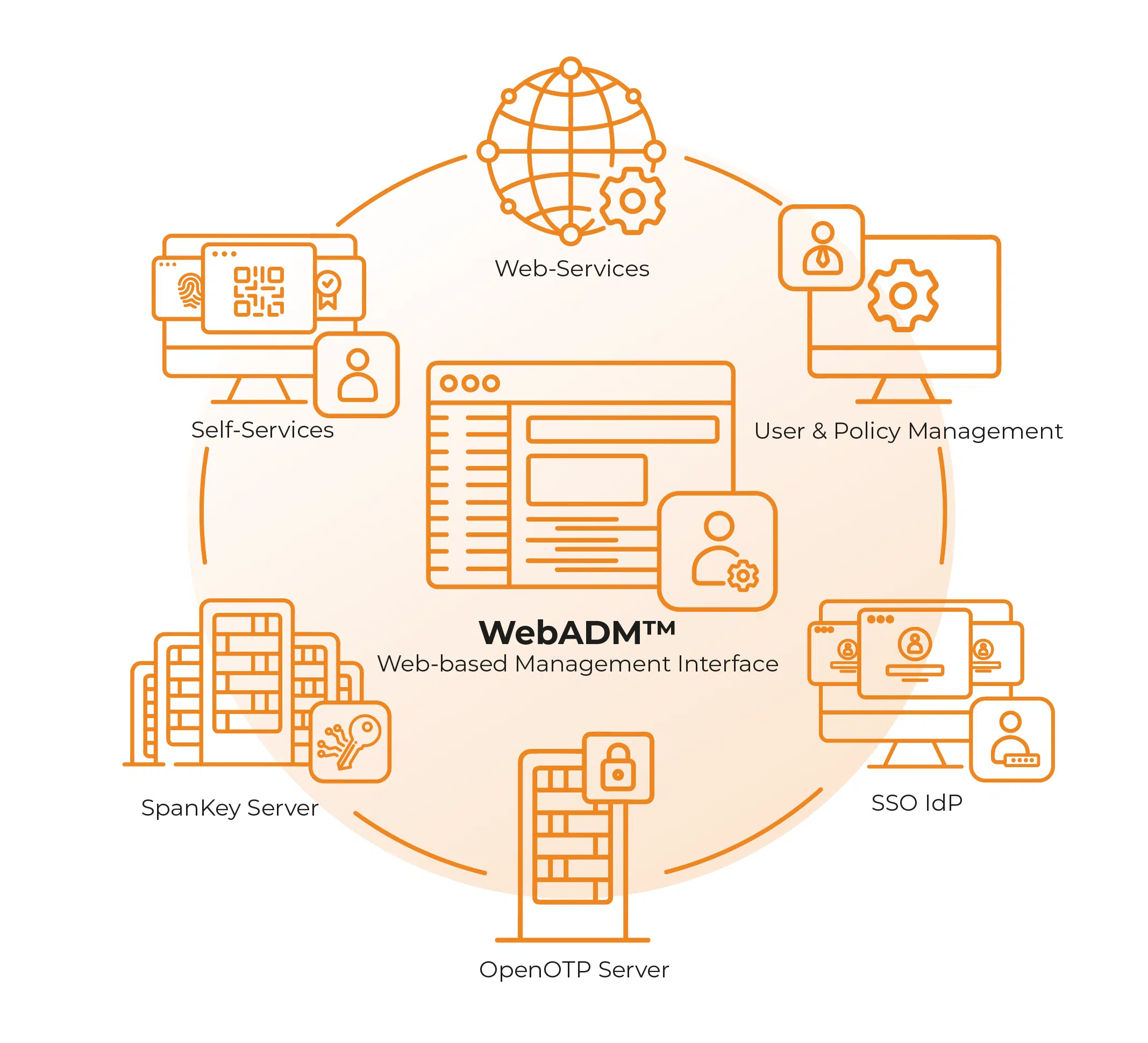 WebADM agit en tant que service et serveur d'application pour OpenOTP, SpanKey, le fournisseur d'identité OpenID Connect / SAML, et les self-services pour les utilisateurs finaux (réinitialisation de mot de passe, inscription de justificatifs d'identité). Il fournit également une interface Helpdesk pour le support délégué de première ligne, permettant des actions limitées et vérifiables sans droits administratifs complets. WebADM fournit le moteur d'exécution, la connectivité à l'annuaire, l'application des politiques et les points d'intégration nécessaires pour fournir une authentification unifiée et une fédération.
